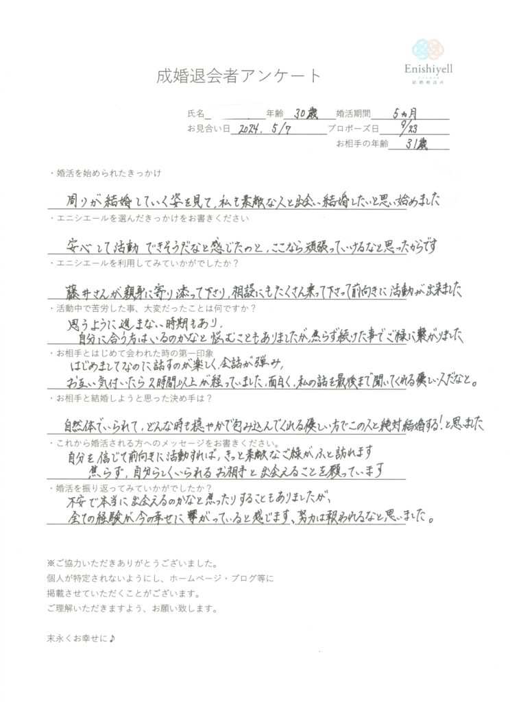 女性会員K様 30歳 奈良在住 活動期間 5ヶ月 お相手 31歳男性