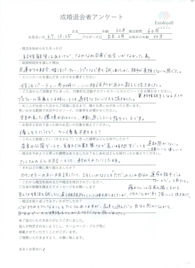 女性会員H様 32歳 奈良在住 活動期間 6ヶ月 お相手 36歳男性
