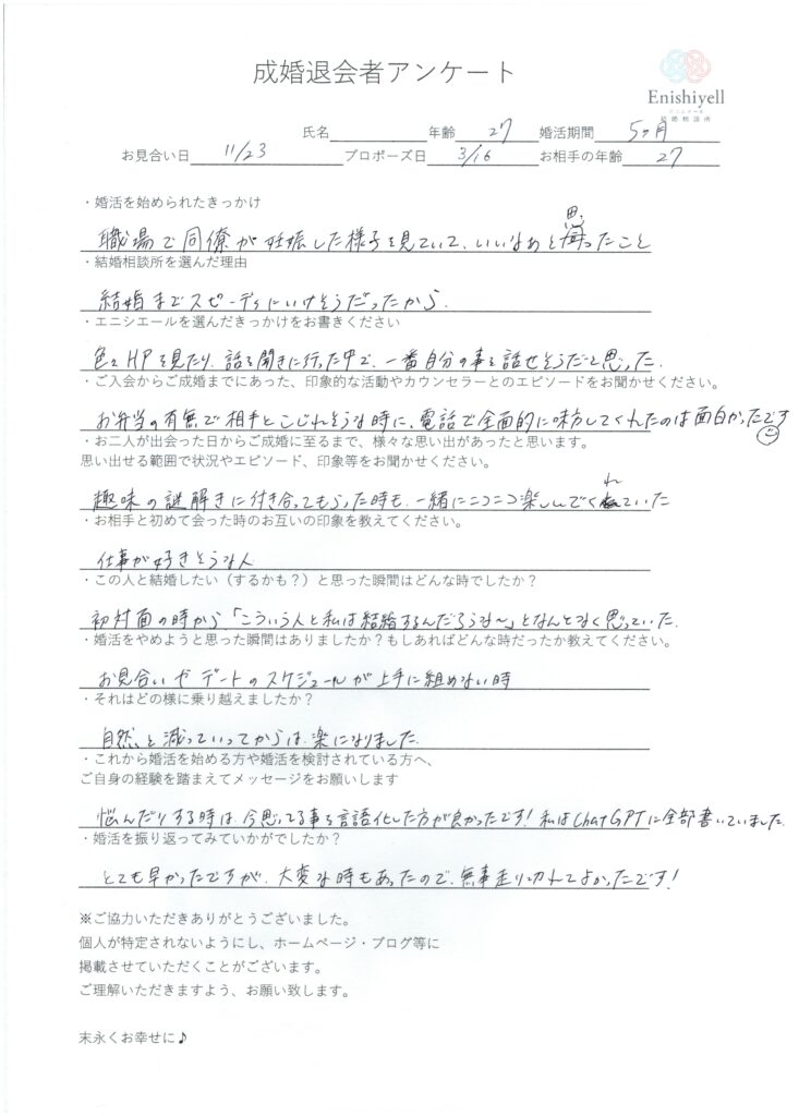 女性会員T様 27歳 奈良在住 活動期間 5ヶ月 お相手 27歳男性